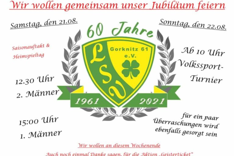 Ring frei für die erste Runde zum 60.: Der LSV Gorknitz 61 e.V. feiert am 21. und 22. August 2021 sein rundes Jubiläum. Nachdem die ursprünglich geplante große Party zum…