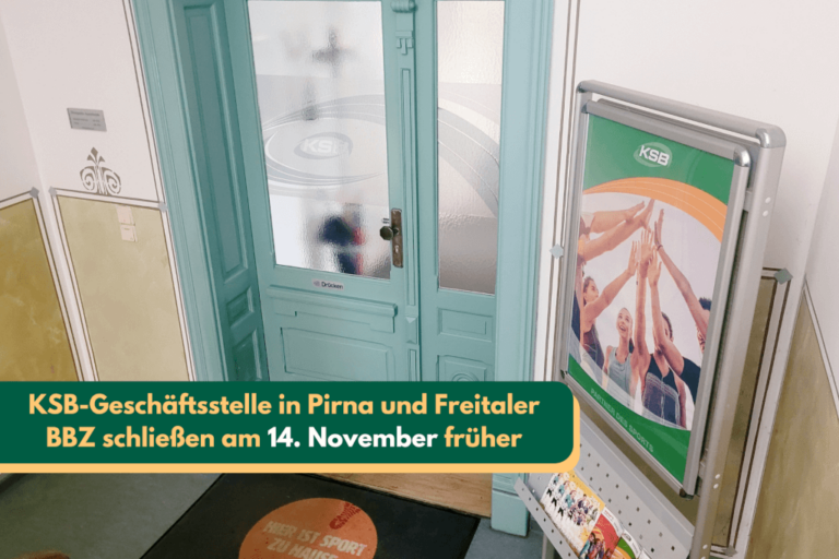 Die Geschäftsstelle des Kreissportbundes in Pirna und das BBZ am Freitaler Stadion des Friedens sind an diesem Donnerstag, dem 14. November 2024, jeweils ab 12 Uhr aufgrund eines mehrstündigen Verbandstreffens…