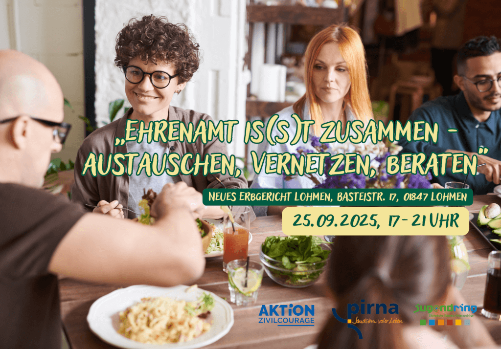 Ganz nach dem Motto „Ehrenamt is(s)t zusammen – austauschen, vernetzen, beraten“ soll das Engagement im Landkreis Sächsische Schweiz-Osterzgebirge gewürdigt werden. Dazu ist dank der Organisation mit dem Aktion Zivilcourage e.V., dem Jugendring Sächsische Schweiz- Osterzgebirge und der Stadt Pirna am 25. September 2025 im „Neuen Erbgericht Lohmen“ ein gemeinsames Essen geplant. Die Teilnahme nach Anmeldung ist kostenfrei. Bei dem Treffen wird es Zeit und Raum für Gespräche und Austausch mit anderen ehrenamtlich Aktiven geben. Der Veranstaltungsort bietet eine offene und gemütliche Atmosphäre. Bei schönem Wetter kann auch das Außengelände genutzt werden.