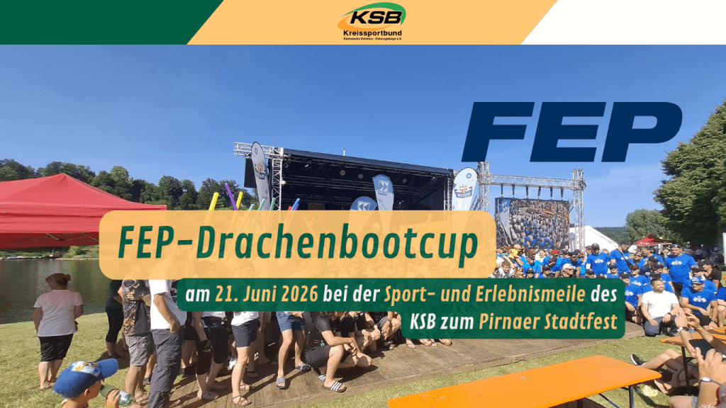 Der FEP-Drachenbootcup wird auch 2026 stattfinden! Am Rande des Pirnaer Stadtfestes und der Sport- und Erlebnismeile des KSB werden am 21. Juni 2026 die Rennen um den FEP-Drachenboot auf der Elbe ausgetragen. Bis zu zwölf Teams können mitmachen. Die verbindlichen Anmeldungen sind ab sofort möglich. Der SV Grün-Weiß Pirna und der Pirnaer Ruderverein 1872 als Ausrichter und die Mitorganisatoren vom Kreissportbund freuen sich auf viele Teilnehmer und Zuschauer bei dem spaßigen Wettstreit auf der Elbe.