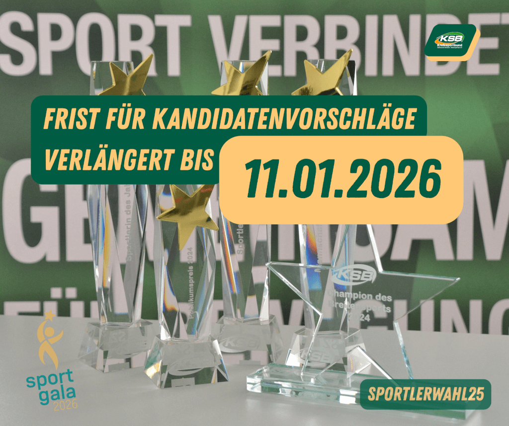 Die Frist für die Vorschläge von Kandidaten für die Wahl der „Sportler des Jahres 2025“ im Landkreis Sächsische Schweiz-Osterzgebirge wird um drei Tage verlängert. Letztmöglicher Termin zur Abgabe der Nominierungsvorschläge ist nun dieser Sonntag, der 11. Januar 2026. Bitte dazu eine E-Mail mit Namen, dem KSB-Mitgliedsverein und den entsprechenden Erfolgen im Jahr 2025 (gerne auch mit dem Ehrungsantrag) an: klingbeil@kreissportbund.net senden.