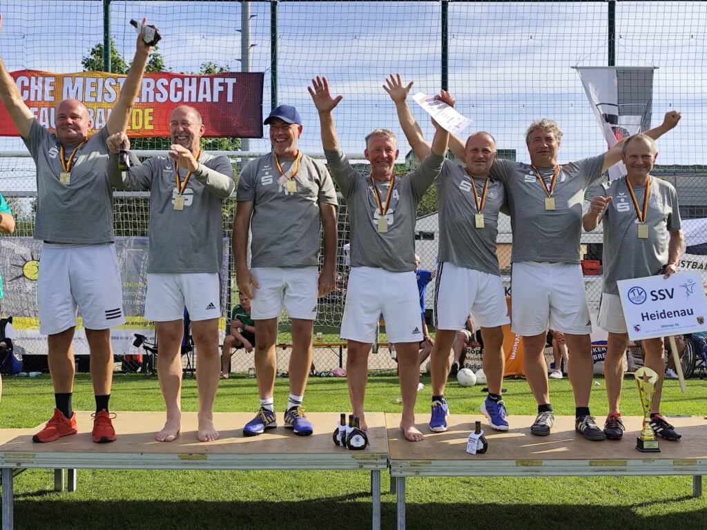 Nach Überraschungs-Gold beim Debüt in der Altersklasse Ü55 in der Hallensaison haben sich die Heidenauer Routiniers nun erneut den ersten Platz bei den Titelkämpfen gesichert, die in Eibelstadt bei Würzburg stattfanden. Dieser Erfolg ist gleichzeitig der erste Deutsche Meistertitel auf dem Feld bzw. Rasen überhaupt für ein SSV-Team. Alle anderen fünf Siege in verschiedenen Altersklassen wurden bislang unter dem Hallendach erkämpft.