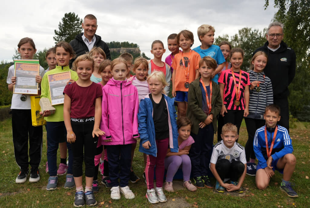 Die Medaillen, Sandsteinpokale, Urkunden und Überraschungstüten für die Königsteiner Steppkes wurden auf dem Sportplatz Pfaffendorf auch im Beisein von Schulleiterin Katrin Richter, Lehrern, Eltern und Helfern überreicht. Auf dem urigen Rasenplatz mit traumhaftem Panorama fand zuvor der Schul-Cross der Grundschule statt. Bei dem sportlichen Wettbewerb mir verschiedene Parcours gaben die rund 90 Kinder ihr Bestes.
