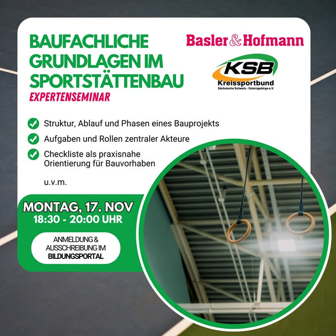 Die Anmeldung für das kostenfreie „Expertenseminar – Baufachliche Grundlagen im Sportstättenbau: Von der Idee bis zur Realisierung“ erfolgt über das Bildungsportal des Landessportbunds Sachsen: https://bildungsportal.sport-fuer-sachsen.de/detail-5795.