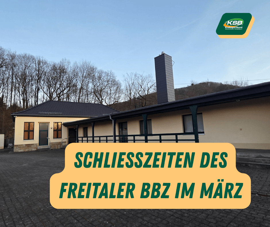 Das Bildungs- und Beratungszentrum des KSB am “Stadion des Friedens” in Freital, ist im März an drei Tagen innerhalb der Öffnungszeiten nur eingeschränkt für den Besucherverkehr geöffnet: Am morgigen Dienstag, dem 10. März 2026, ist das BBZ wegen eines Lehrgang bereits um 16.30 Uhr geschlossen und am Donnerstag, dem 12. März 2026, aus organisatorischen Gründen ab 16 Uhr. Außerdem ist das BBZ am 19. März 2026 aufgrund einer Verbandsveranstaltung erst ab 14 Uhr wieder für Besucher geöffnet. Wir bitten um Ihr Verständnis. Dankeschön.