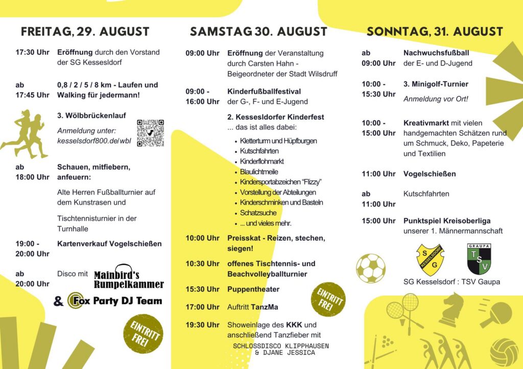 Ab heute wird drei Tage gefeiert: Die Sportgemeinschaft Kesselsdorf wird 80. Zum Jubiläum des KSB-Mitgliedsvereins mit seinem Sportplatz „Zur Alten Poststraße 19“ im Wilsdruffer Ortsteil Kesselsdorf gibt es zahlreiche Sport- und Unterhaltungsangebote. Am heutige Freitag um 17.30 Uhr geht es los. Das Programm des Vereins- und Dorffestes befindet sich HIER.
