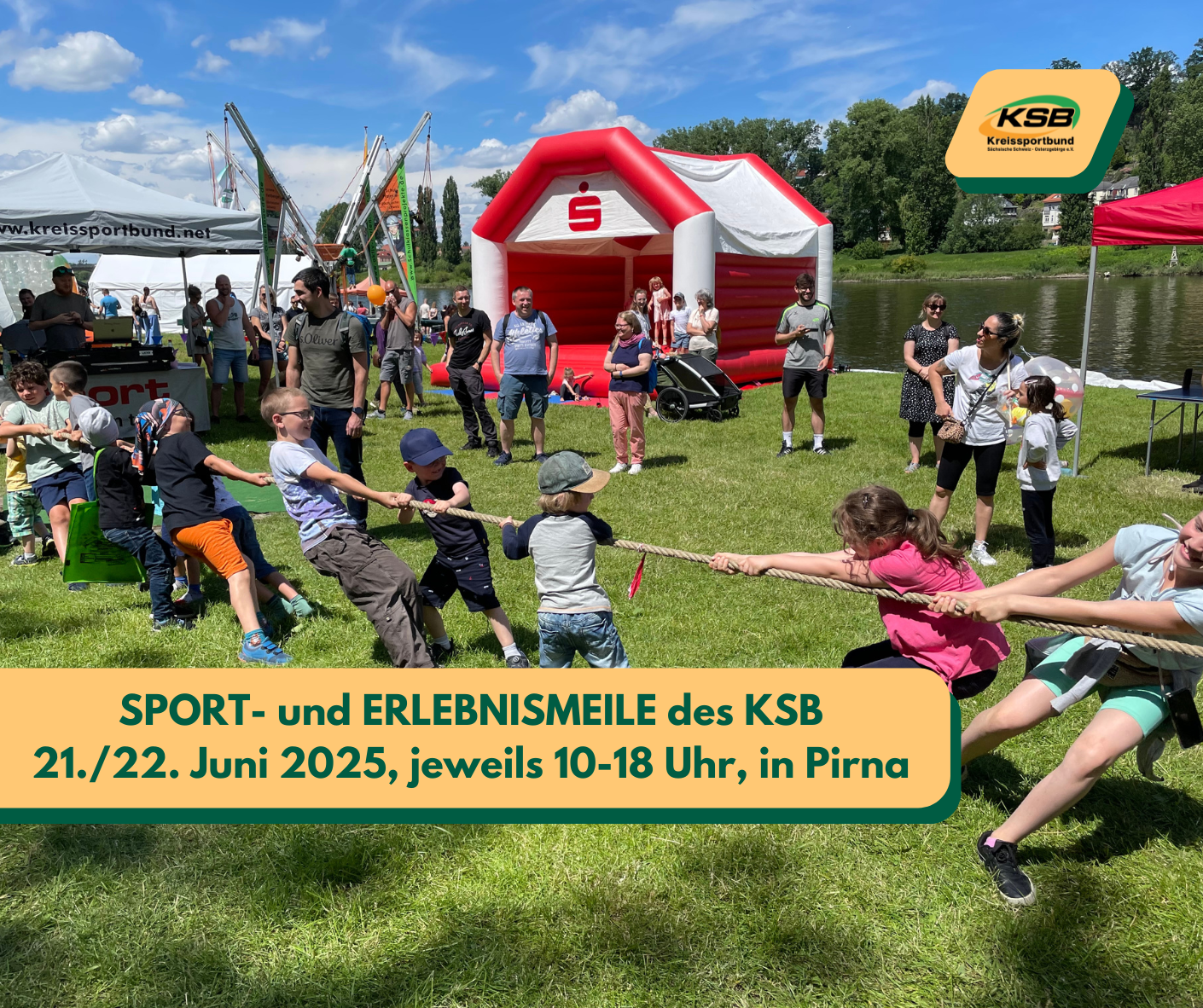 Im Rahmen des Pirnaer Stadtfest veranstaltet der Kreissportbund am 21. und 22. Juni 2025 auf den Elbwiesen wieder tagsüber, jeweils von 10 bis 18 Uhr, seine Sport- und Erlebnismeile mit mehreren Mitmachangeboten. Vereine werden sich ebenfalls dort den Besuchern präsentieren.