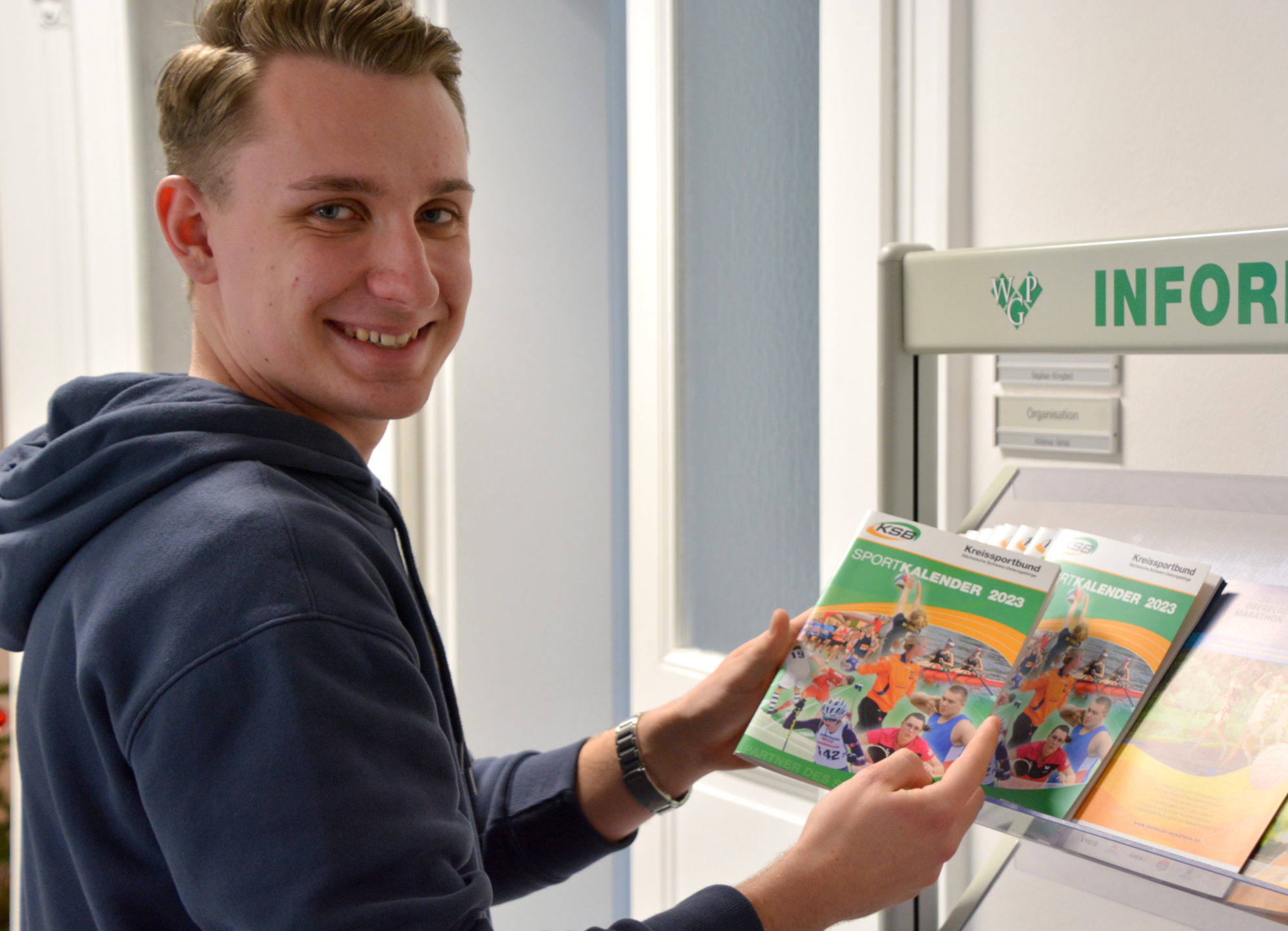 Der neue „Sportkalender 2023“ des Kreissportbundes Sächsische Schweiz-Osterzgebirge ist da! Die informative Übersichtssammlung des KSB und seiner Mitgliedsvereine ist jetzt in der Geschäftsstelle des KSB in Pirna erhältlich. BA-Student Tom Hirsch räumte am heutigen Freitag die ersten druckfrischen Exemplare in die Auslage der Geschäftsstelle in der Gartenstraße ein.