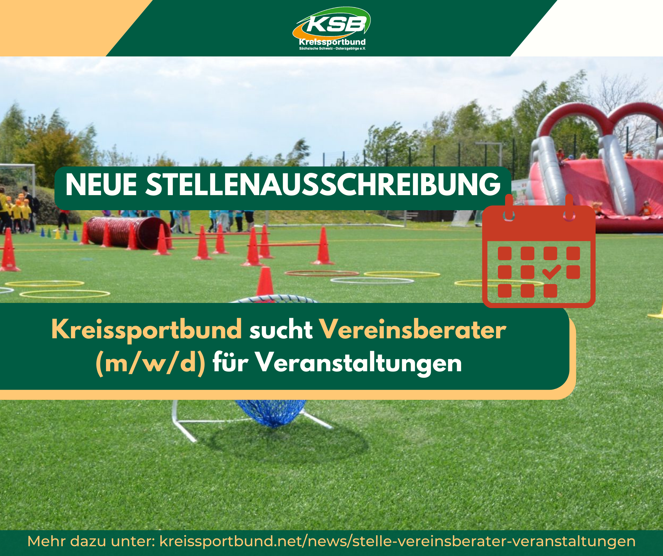 Zur Verstärkung seiner Pirnaer Geschäftsstelle sucht der Kreissportbund Sächsische Schweiz-Osterzgebirge e.V. (KSB) zum nächstmöglichen Zeitpunkt einen Vereinsberater Veranstaltungen (m/w/d). Der KSB ist die größte Bürgerorganisation des Landkreises und vertritt die Interessen von über 42.800 Kindern, Jugendlichen und Erwachsenen in rund 300 Sportvereinen.