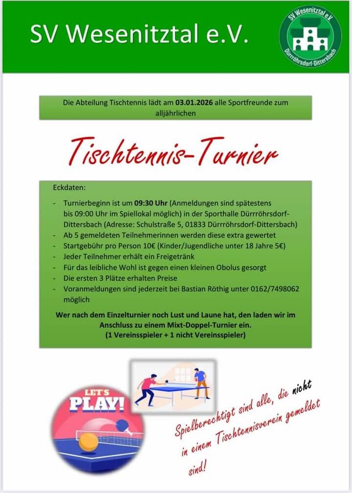 Die Tischtennisabteilung des SV Wesenitztal e.V. veranstaltet am 03. Januar 2026 ihr traditionelles Tischtennisturnier für tischtennisbegeisterte Hobbysportler.