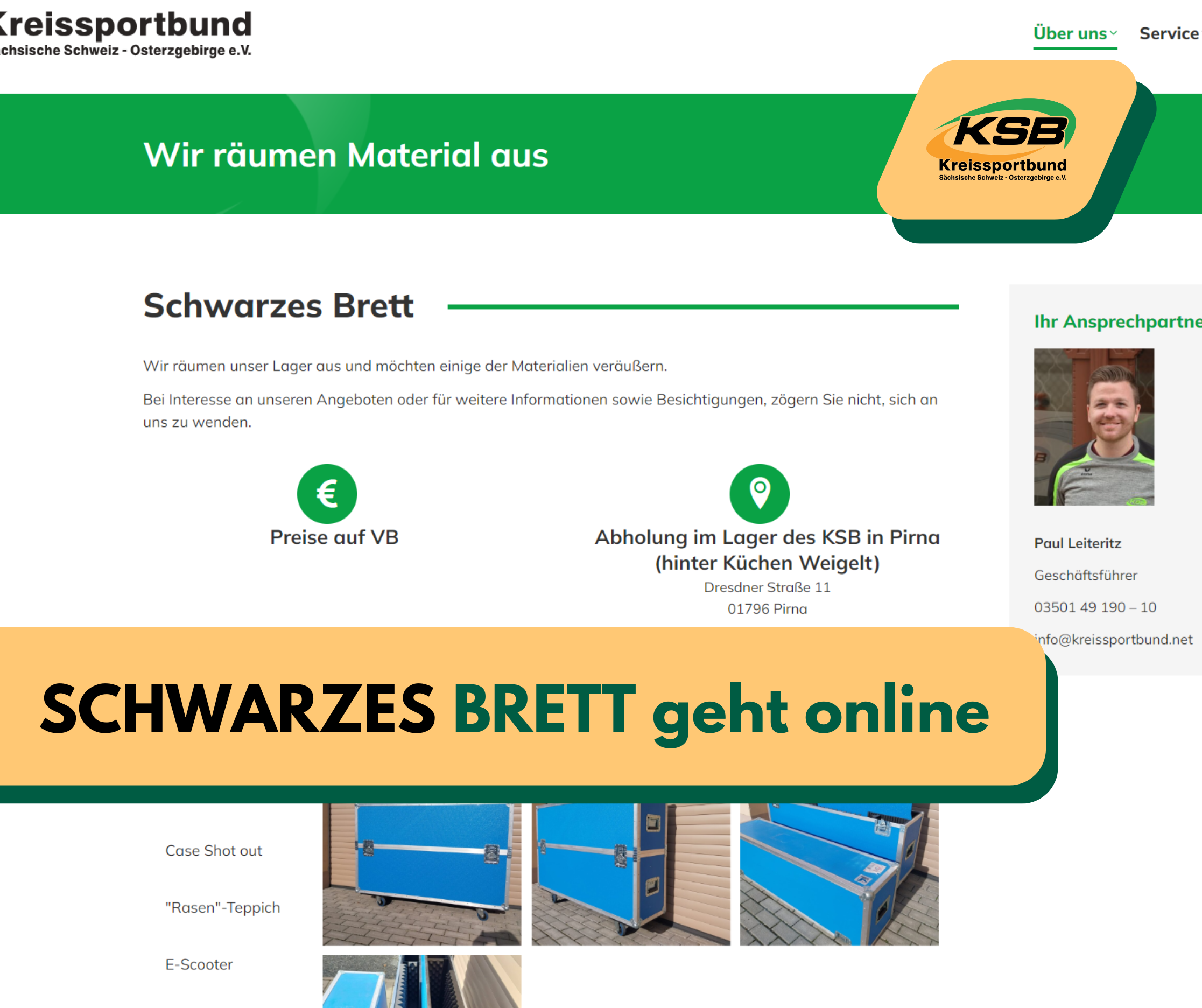 Der Kreissportbund räumt auf und veräußert und Material aus seinem Lager. Dazu ist nun ein Liste auf der KSB-Homepage veröffentlicht worden, auf dem die Gegenstände auf Fotos zu sehen sind. Die Preise für die dortigen Angebote sind auf Verhandlungsbasis.